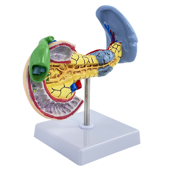 Model przedstawia szczegółową budowę narządów jamy brzusznej, obejmującą śledzionę, trzustkę, pęcherzyk żółciowy wraz z przewodami żółciowymi oraz fragment dwunastnicy. Struktury zostały wyraźnie wyróżnione kolorystycznie, co ułatwia ich identyfikację i naukę topografii anatomicznej. Dodatkowo uwzględniono przebieg naczyń krwionośnych w tej części układu.