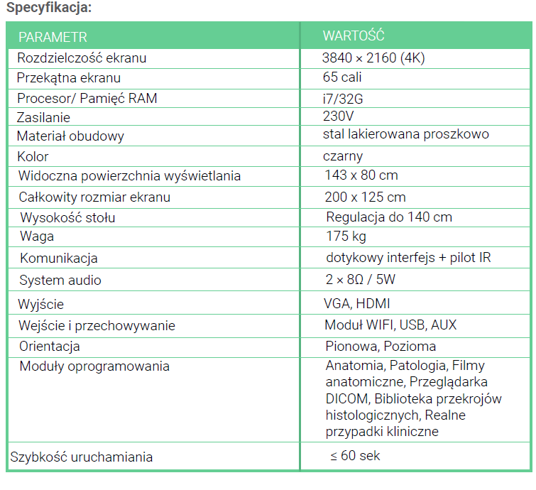 Interaktywny, wirtualny stół anatomiczny 3D, 65′