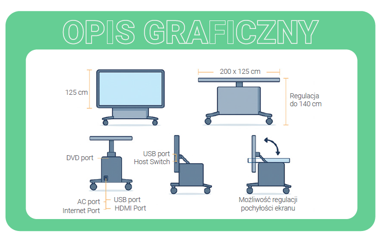 Mobilny stojak z kółkami umożliwia łatwe przemieszczanie urządzenia pomiędzy salami, a obracany ekran pozwala pracować zarówno w pozycji pionowej, jak i poziomej – w zależności od charakteru zajęć.